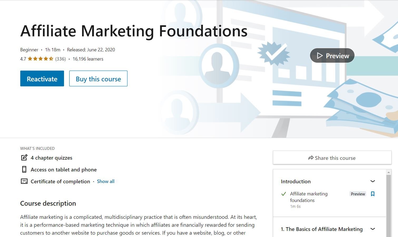 This beginner-level affiliate marketing course includes all the basics of digital marketing, especially social media marketing and content creating tools. It also features lessons on video advertising, SEO, email marketing, and an entire section dedicated to affiliate marketing. Former students say the content is clear, motivating, and insightful. With a few materials to read, learn and master the material through short quizzes and practice files, and get verified answers provided by the instructor.