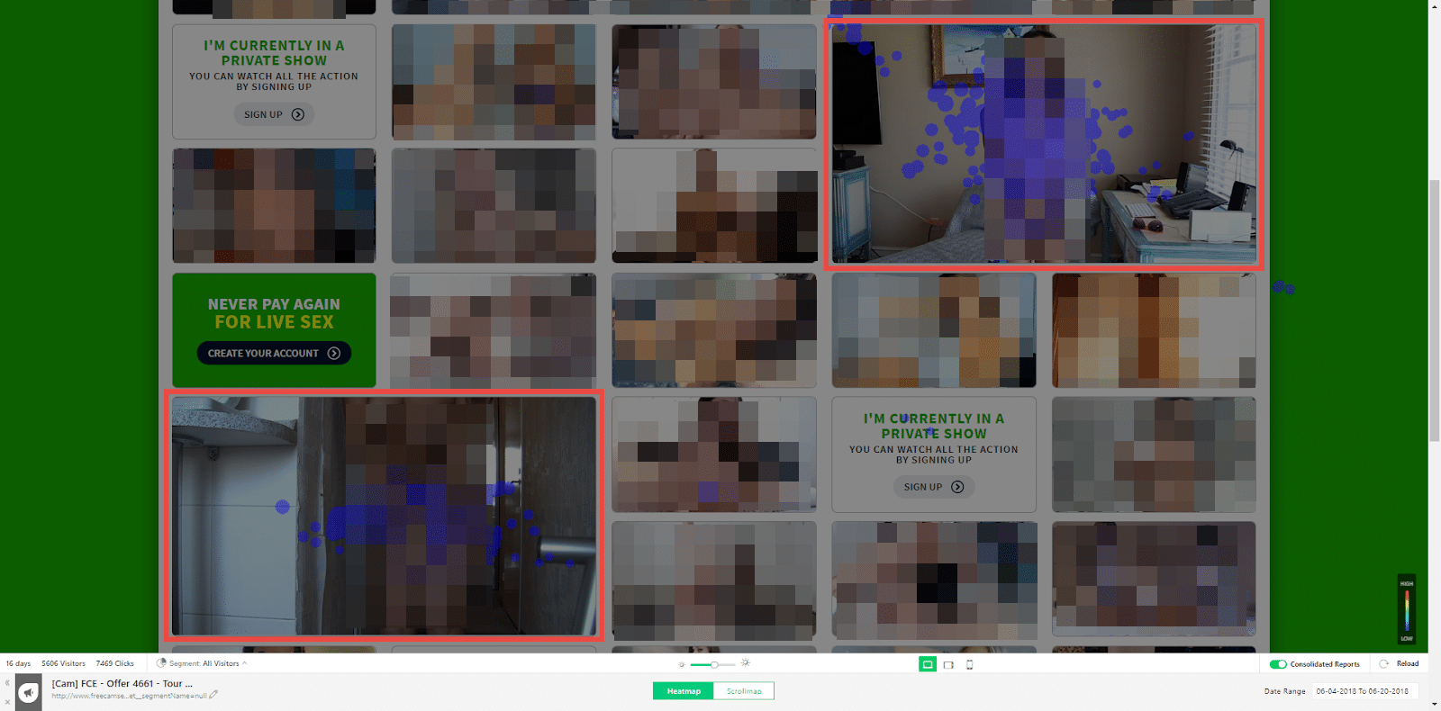 Further analysis of the MyFreeCams/FreeCams Exposed landing page revealed that our play button for video playback was 9 times more clicked than the frame itself — 5.9% (438 clicks) vs. 0.6% (48 clicks).