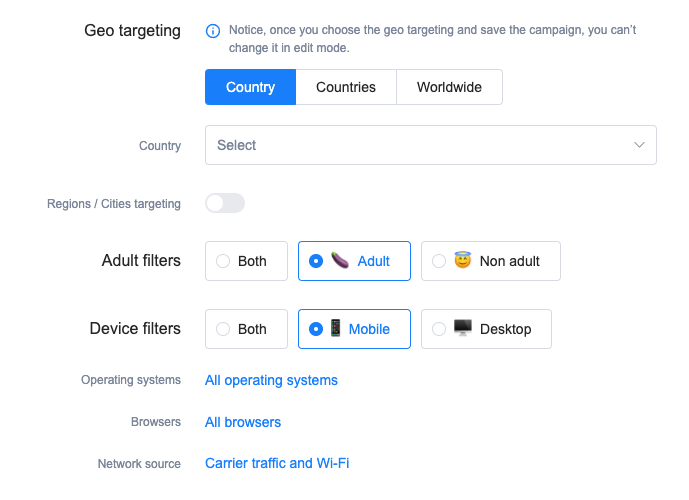 The next step is choosing geo-targeting country(ies) and setting the adult and device filters. We recommend selecting mobile-only and setting adult filters according to the type of your offer.