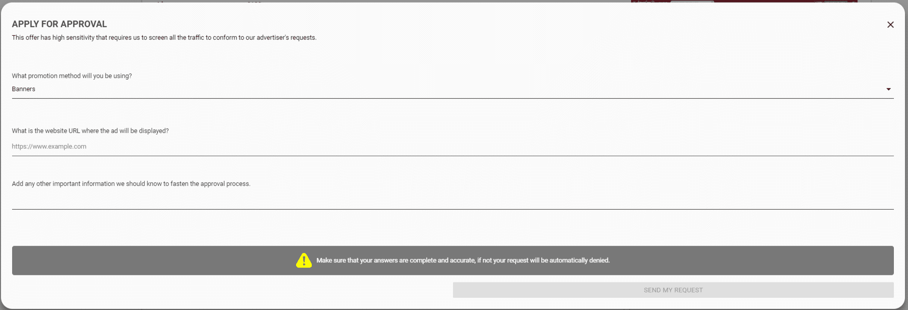 The first and most direct method to gain access to an offer is to click on the “Request Approval” button on the offer page and answer the questions on the form.