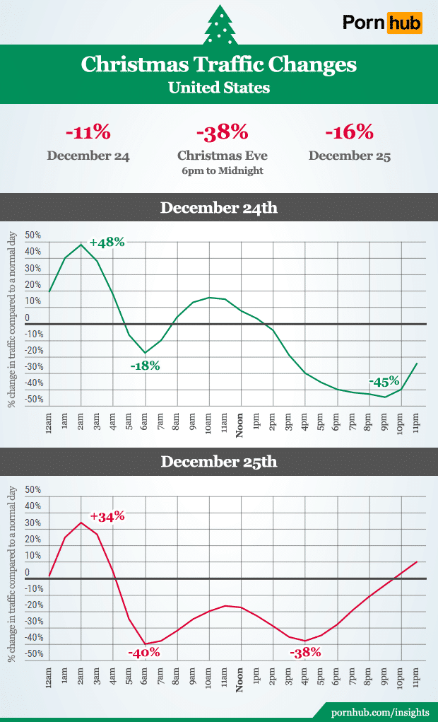 One golden rule for media buyers over the holidays is to not overbid. Stay calm, focused and don’t forget to run plenty of A/B tests. Because yes, the traffic drop is real. According to Pornhub Insights in 2016, traffic was at -11% on December 24th for the popular adult tube. Between 6PM and Midnight, it was even worse with a -38% nosedive in traffic. And on Christmas day, traffic plummeted at -16%.