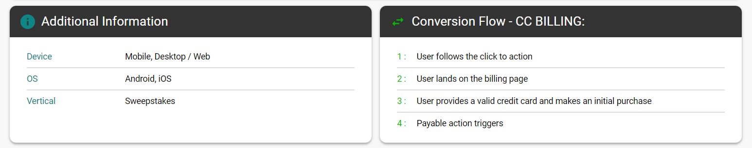 For the more experienced affiliates, we encourage you to try CC submit offers, given that you have more experience with creating pre-lander pages and using more promo tools. A bigger budget will be needed to successfully promote CC submits, but the results will definitely be worth it.