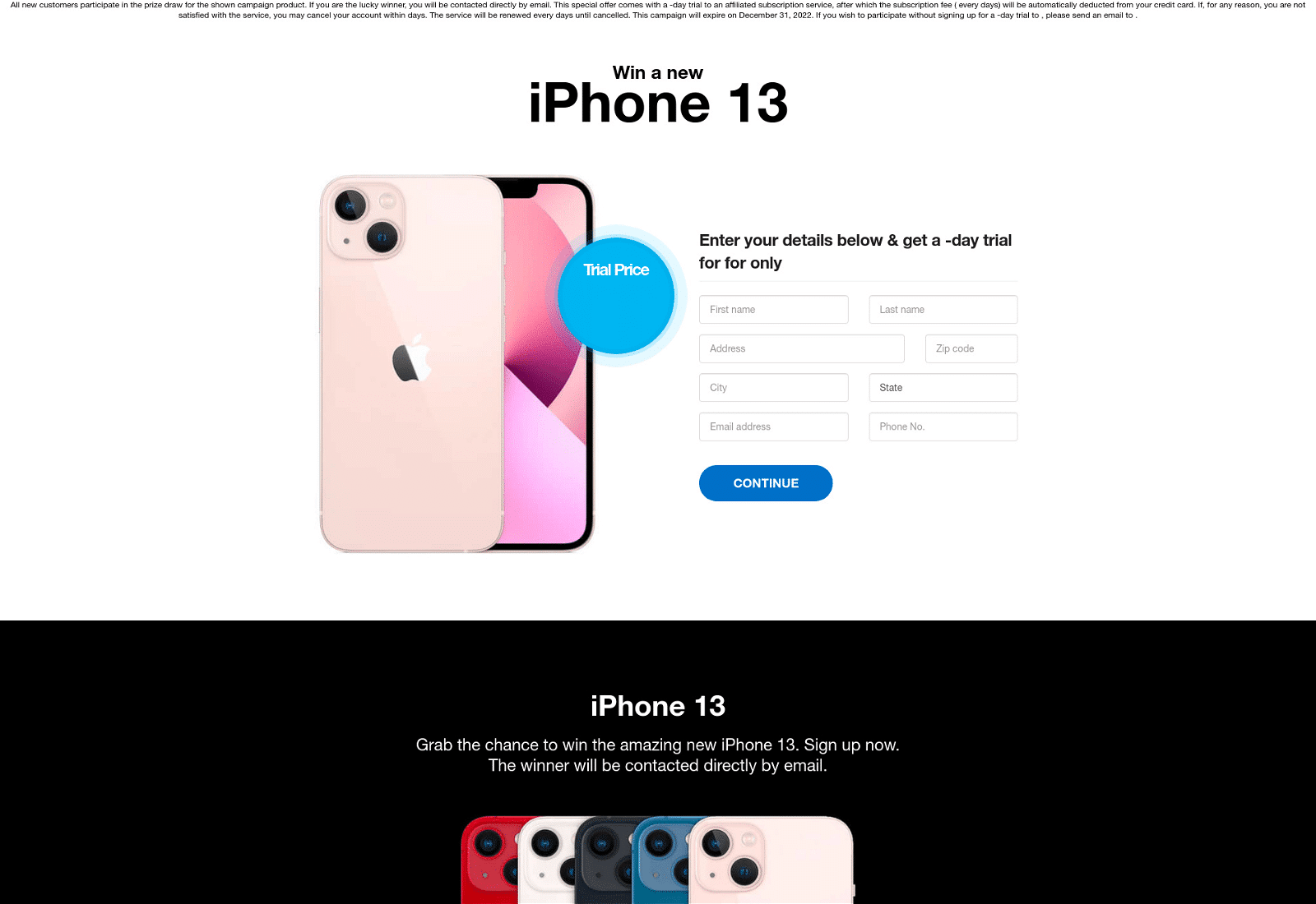 • Pay per Sale (PPS): The affiliate gets a given amount every time a visitor purchases a ticket to enter the sweepstakes. The conversion is complete when the user’s credit card information is collected. For instance, this iPhone 13 offer requires the user to pay $3 to enter the sweepstakes.
